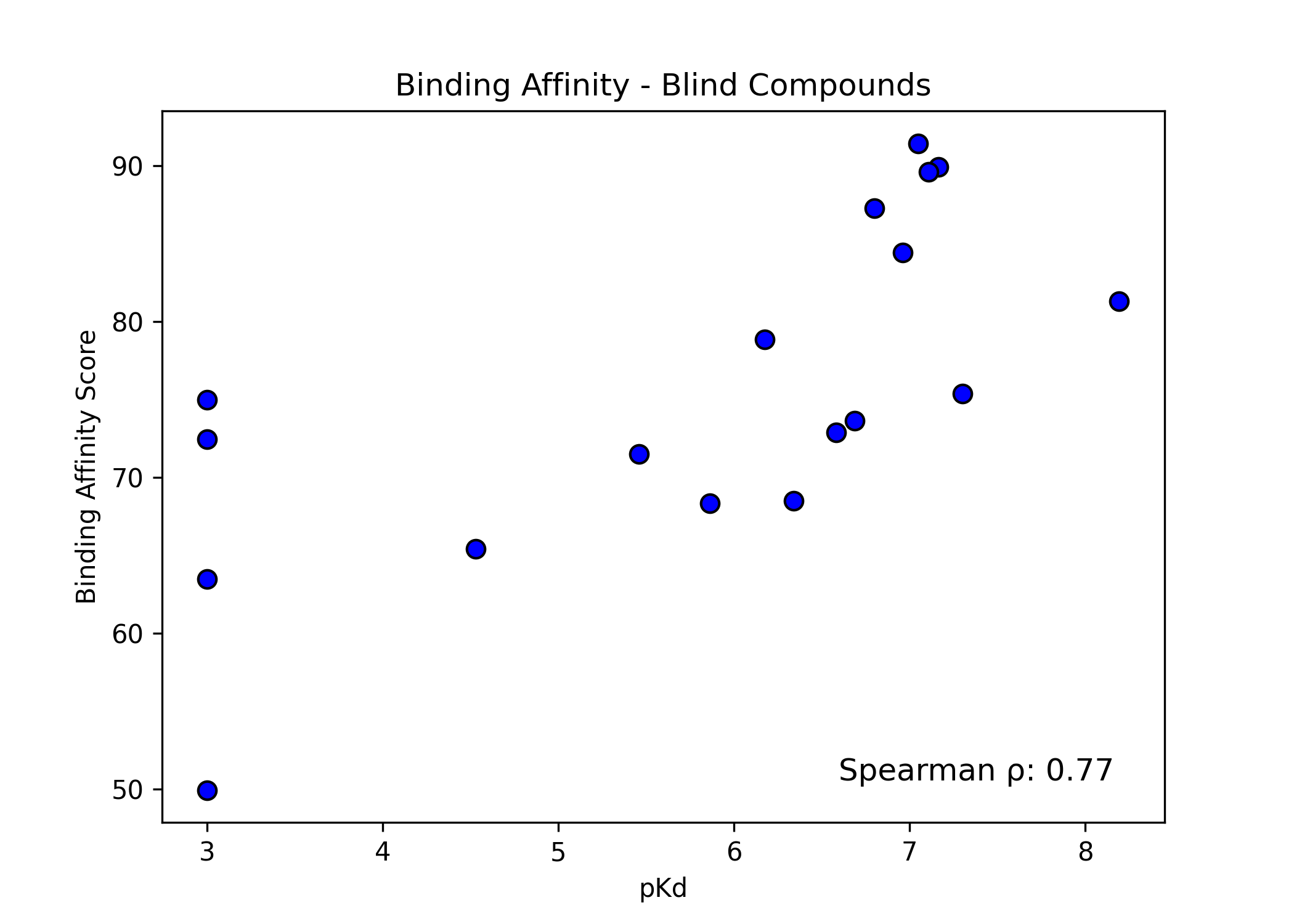 In collaboration with a pharmaceutical partner, Koffee™ Binding Affinity achieved a Spearman correlation coefficient (ρ) of 0.6 on previously characterized (unblinded) compounds and 0.77 on a blinded test set.